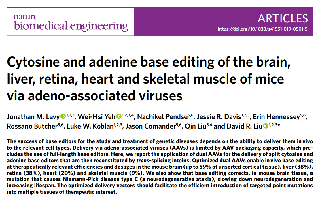 #CRISPR#baseediting by the@liugroup using split BEs/intein/AAV approach in a variety of tissues with impressive editing efficiencies@natBME -very cool!https://twitter.com/natBME/status/1217451276046389249 …