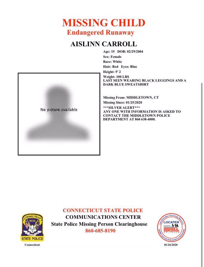 Silver Alert: Aislinn Carroll (15) missing from Middletown call 860-347-2541 with infopic.twitter.com/VzaXmxKqde