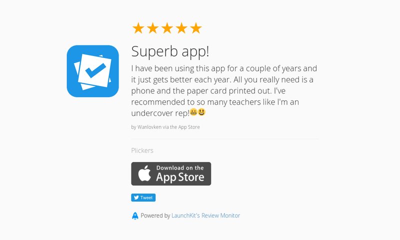5 Star Review: "Great app: I love plickers. I just tried it this year and absolutely loved…" https://launchkit.io/reviews/j-c0KuDGUqU/ …pic.twitter.com/N7IXn8fRZA