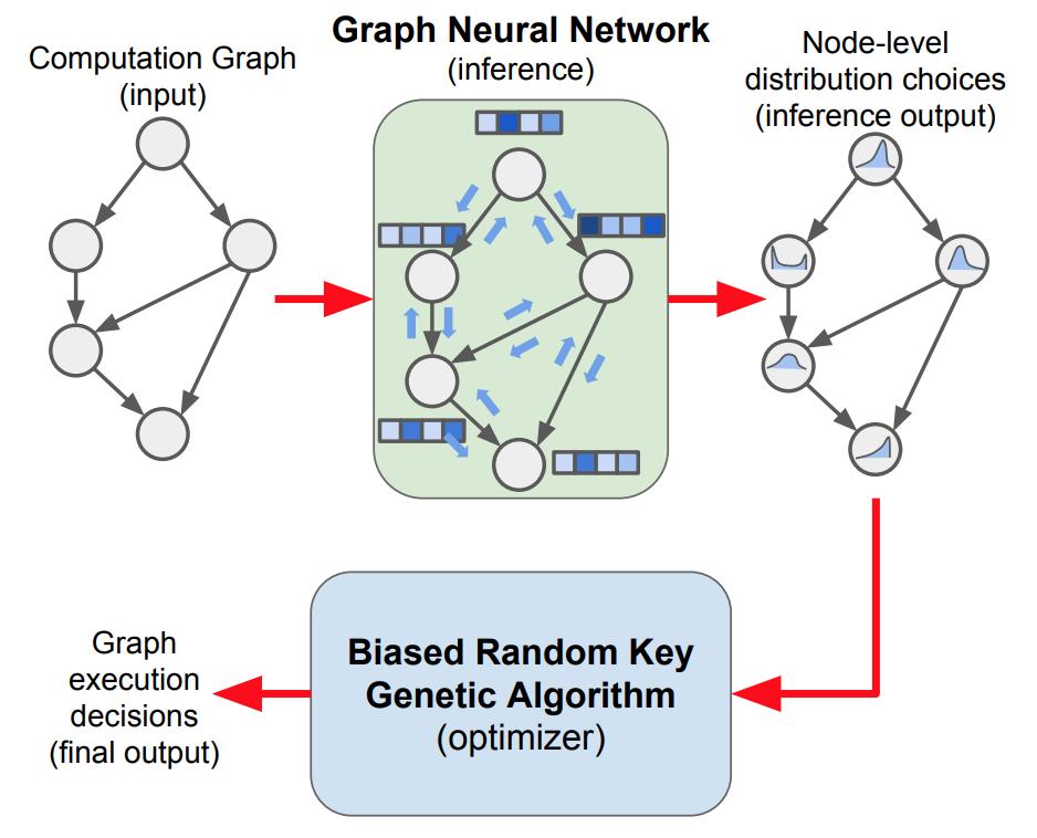 Graph neural net + REINFORCE + genetic algorithm = 3% or more memory reduction for your computation graph. Learned model can generalize to unseen graphs 10x larger and with unseen op types. Runtime can also be optimized. Paper: https://arxiv.org/abs/1905.02494 pic.twitter.com/WXIm3T1C4Z