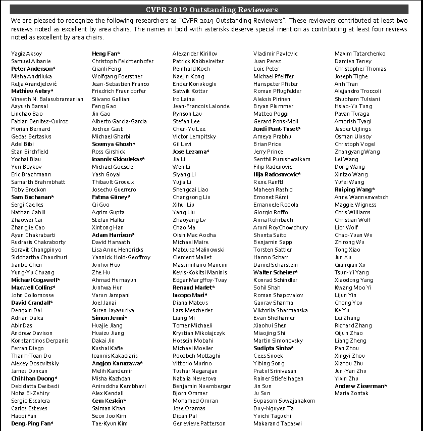 CVPR thought I was an outstanding reviewer, surprise! No email or anything, only realized when someone else told me. Thought people would gradually stop reviewing for conferences as they get more senior, but wrong - ACs must be lucky to have Andrew Zisserman as a reviewer!https://twitter.com/cvpr2019/status/1137626416550252544 …
