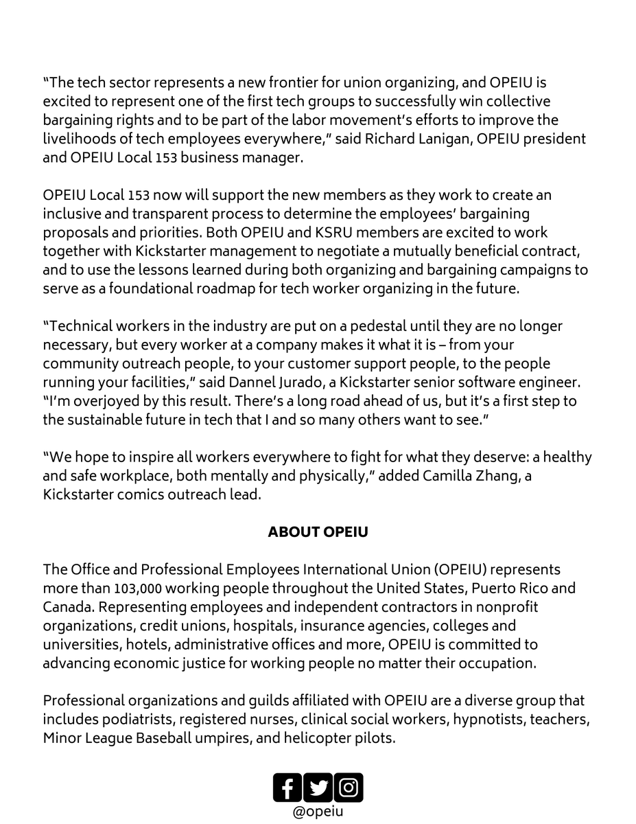 OPEIU is PROUD to welcome @ksr_united, one of the FIRST TECH UNIONS IN U.S. HISTORY, into our big union family. Our media release on this historic win for working people