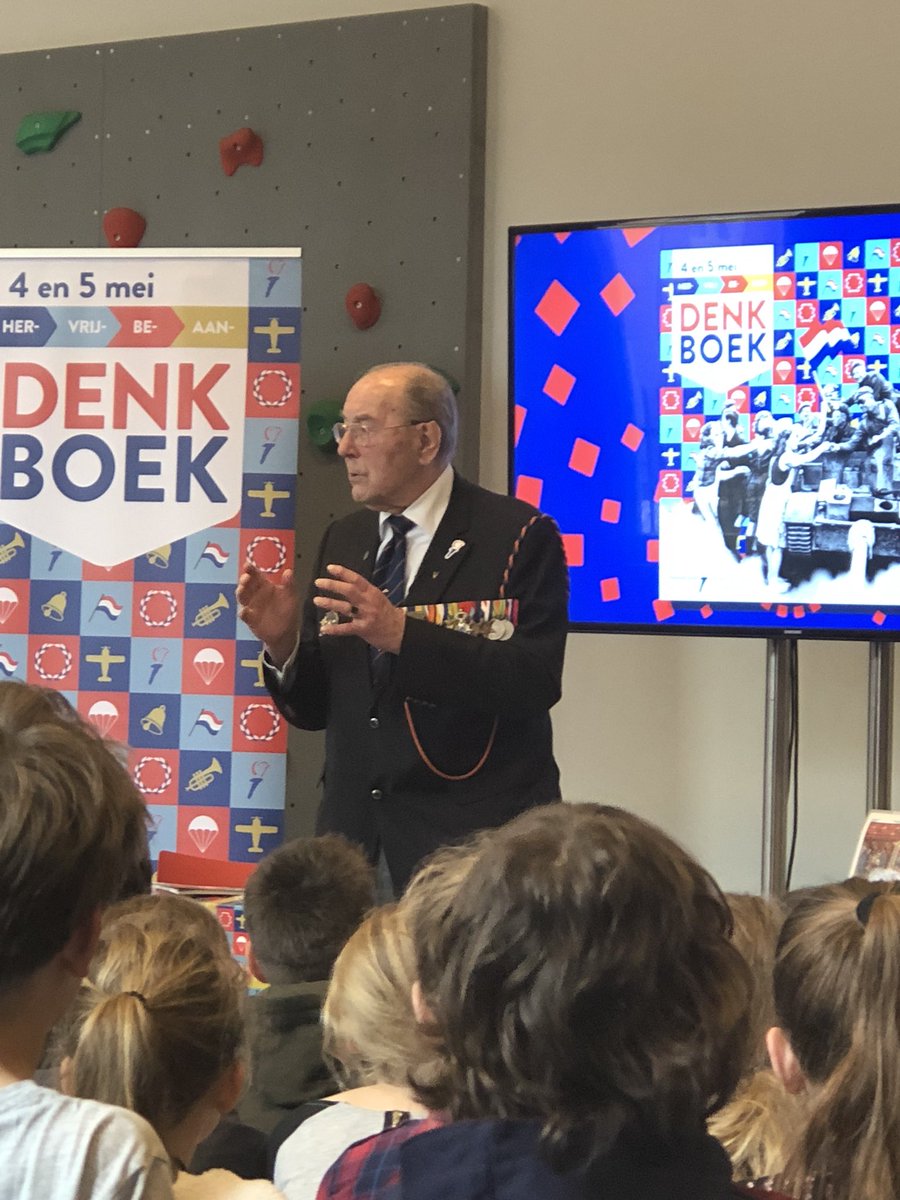 Leerlingen groep 7/8 Haagse Annie MG Schmidtschool hangen aan de lippen van verzetsheld Rudi Hemmes tijdens uitreiken eerste gedenkboek