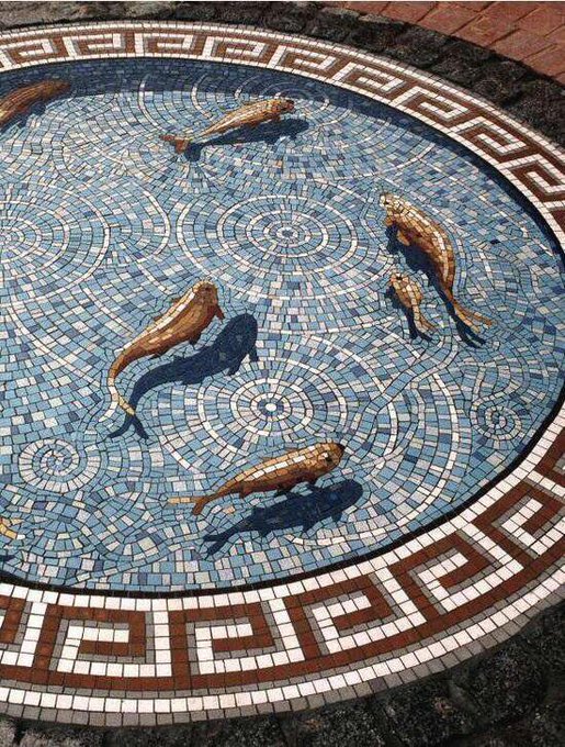 This fishpond mosaic forms the central feature in an award winning small public garden in the business area of central Croydon, UK (1996). It makes use of a briliant trompe L’oeil design and creates an actual illusion of floating fish with shadows https://buff.ly/2vXpDZ5 pic.twitter.com/4ZFtlkXFk8