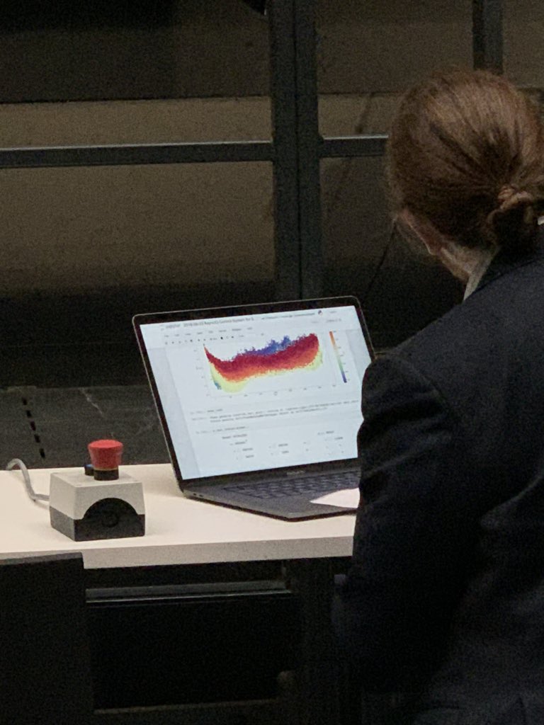 That was me. The big red button is an emergency stop for the motion of the imaging system. There are many safety features built in (infrared sensors to prevent the 8 m beam from crushing someone standing below, e.g.), but it always there in case things go pear-shaped.