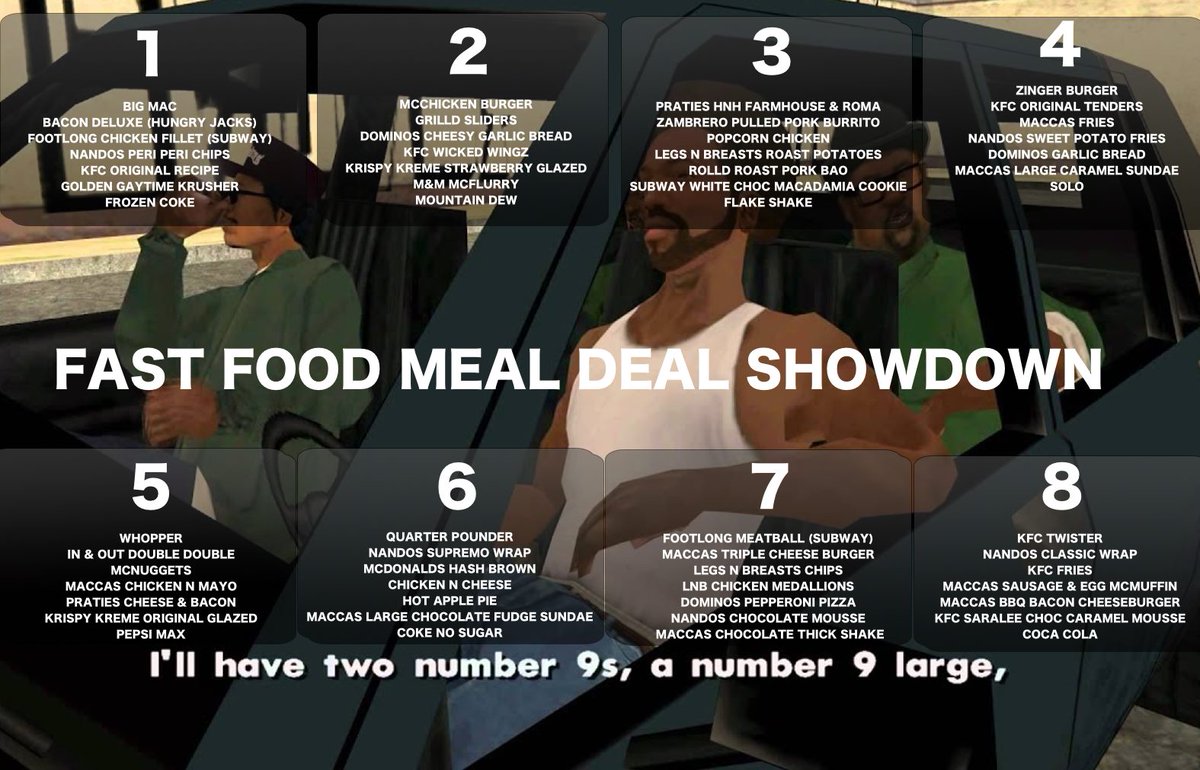 "I'll take Two number 9s, a number 9 large, a number 6 with extra dip, a number 7, two number 45s, one with cheese, and a large soda." But which fast food meal would you choose to order from these options?pic.twitter.com/FBaoavgYp6