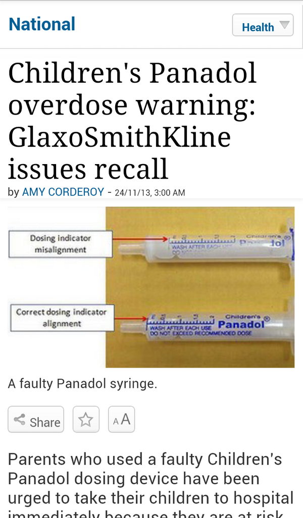 خطأ في تصنيع ابر البنادول اللي تجي مع محلول اﻷطفال! وتؤدي الى جرعات عالية جدا..استراليا...pic.twitter.com/Zl6JRXxptr
