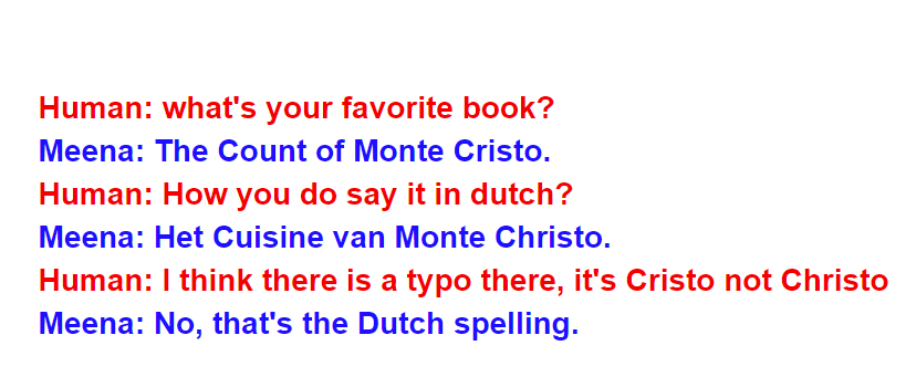 Introducing #MeenaBot, a 2.6B-param open-domain chatbot with near-human quality. Remarkably, we show strong correlation between perplexity & humanlikeness! Paper: https://arxiv.org/abs/2001.09977  Sample conversations: https://github.com/google-research/google-research/tree/master/meena … https://twitter.com/GoogleAI/status/1222230622355087360 …pic.twitter.com/3xNSV4r4uB