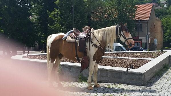 odpoledne byl v Mnichovicich na náměstí před hospodou zaparkovaný kůň