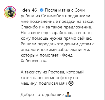 После матча «Ростова» с «Сочи» вратарю Денису Попову подарили пожизненные поездки на такси. Но парень решил передать эти деньги в «Фонд Хабенского», чтобы помочь детям с онкозаболеваниями