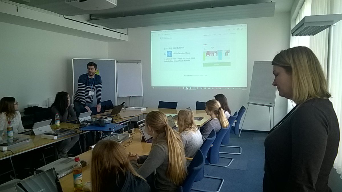 @lolog und@jansche programmieren mit unseren#girlsday Besucherinnen ein eigenes Spiel#gamedevpic.twitter.com/1mmSFfDiqw