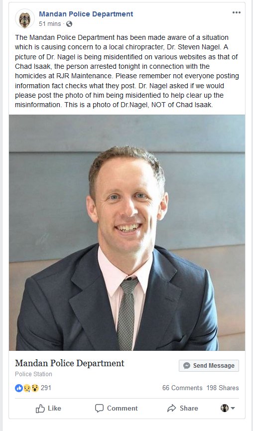 "The Mandan Police Department has been made aware of a situation which is causing concern to a local chiropractor, Dr. Steven Nagel. A picture of Dr. Nagel is being misidentified on various websites as that of Chad Isaak. This is a photo of Dr. Nagel, NOT of Chad Isaak."pic.twitter.com/bckU8d3VdR