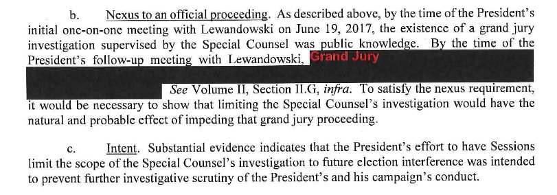 You're right that in that section the "intent" requirement for criminal obstruction seems to be satisfied, but Mueller also says that it's not clear the "nexus to an official proceeding" requirement is satisfied.pic.twitter.com/O2ysjgRrOr