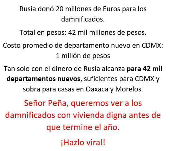 @PutinRF_Eng Mr Putin the Mexicans appreciate ur help but please don’t donate directly to the government cause help doesn’t reach victims