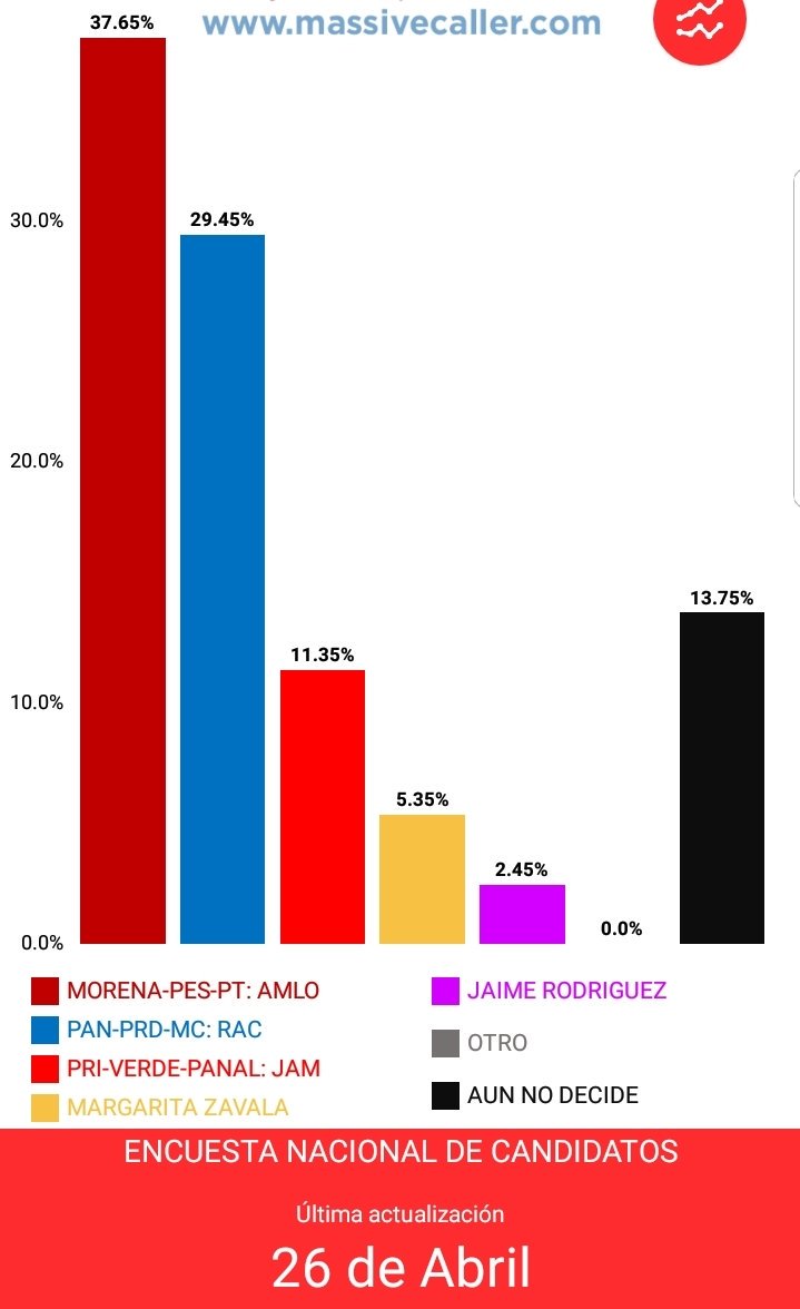 @MassiveCaller actualización al 26 de Abril #AMLO 37.65% (sube) #Anaya 29.45% (se mantiene) #Meade 11.35% (se mantiene) #Zavala 5.35% (se mantiene) #Bronco 2.45% (sube) #Elecciones2018 #México #PreferenciaElectoral #Encuestapic.twitter.com/Qt57zecfRO