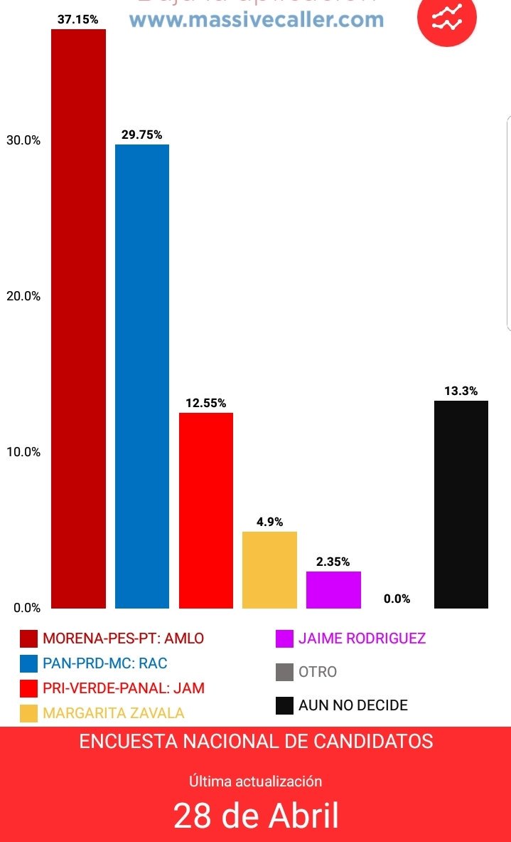 @MassiveCaller actualización al 28 de Abril#AMLO 37.15% (se mantiene)#Anaya 29.75% (sube)#Meade 12.55% (sube)#Zavala 4.90% (se mantiene )#Bronco 2.35% (se mantiene)#Elecciones2018#México#PreferenciaElectoral#Encuestapic.twitter.com/poXZyfq0b1
