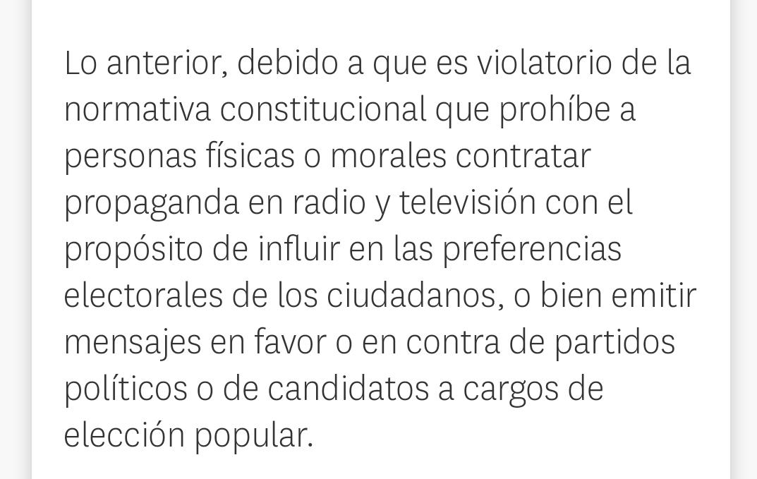 Esto no debería aplicar ya que si bien todos no contratamos propaganda si emitimos (mayormente en redes sociales) mensajes a favor o en contra de partidos y candidatos, así que de querer aplicarlo al espot deberían hacerlo con cada persona que emita comentario en una red socialpic.twitter.com/7XjSCBO5TT
