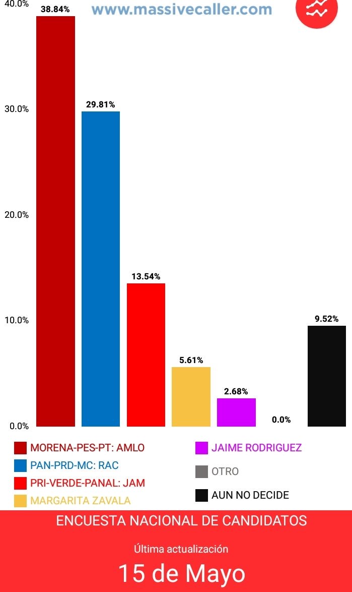 #AMLO 38.84%#Anaya 29.81%#Meade 13.54%#Zavala 5.61%#Bronco 2.68%#Elecciones2018#México#PreferenciaElectoral#Encuesta#EleccionesMexicopic.twitter.com/aZPMHlygVp