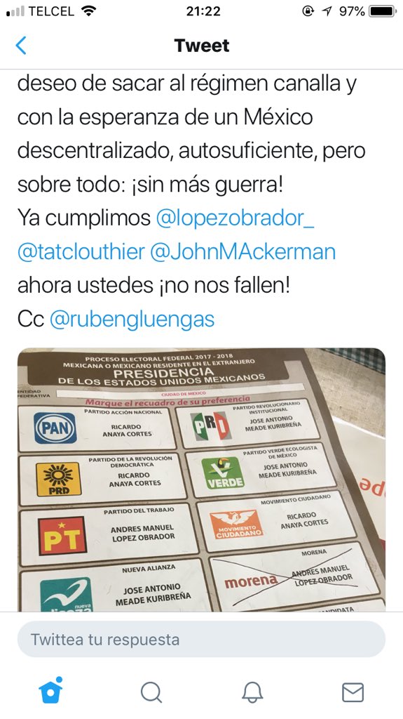 Hola paisanos cuando marquen su boleta electoral tomen foto a la misma para que el gobierno no las cambie a favor de MEADE o ANAYA y sea justo para ustedes