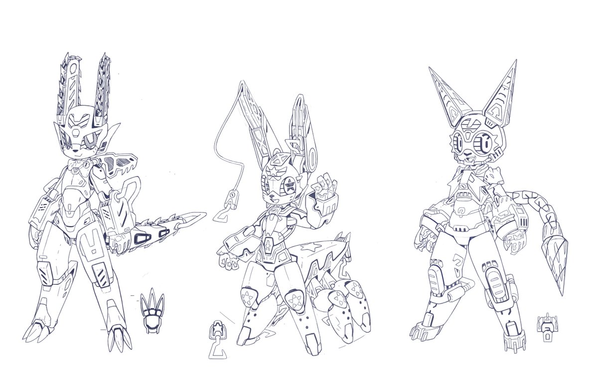 Rex and Drills. They're roibeasts, which are robot rabbits based on amalgamation between animal and inanimate object(mostly machines). Rex is based on T-rex and Chainsaw while Drills is saber tooth tiger and, well, drills.pic.twitter.com/eYNdl97usP