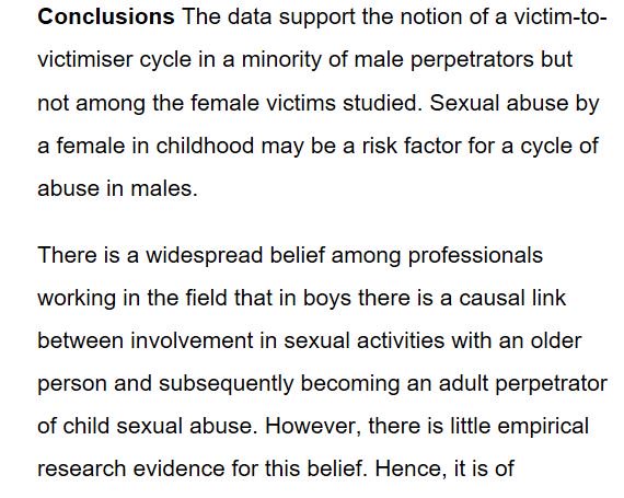 It is incredibly inaccurate to claim that "most abusers were abused" when it has been found to occur only in a minority of perpetrators. Beliefs and empirical research evidence are wholly different concepts.pic.twitter.com/Lkbi8OspkE