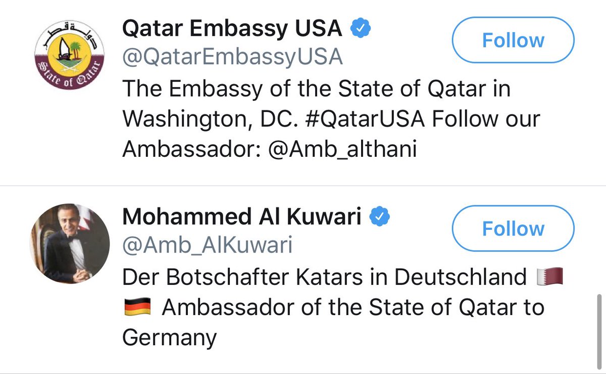 فعلا ملاحظة مهمة.. اول حسابين تابعهم سراج عاصي في تويتر حساب السفير القطري بالمانيا وحساب السفارة القطرية في امريكا! https://twitter.com/klysalt/status/1224487587429212160 …pic.twitter.com/AS5gLiSj8Z