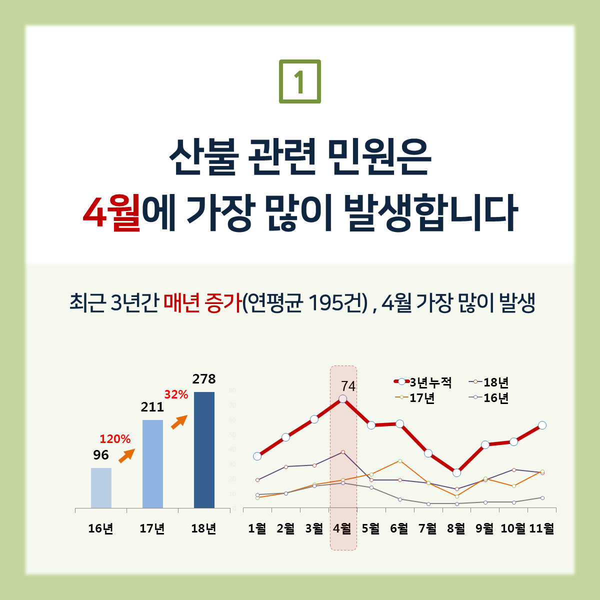 #산불 관련 민원 585건의 분석결과 알려드립니다. ‘위험행위 단속 요청’이 53.2%로 가장 많았습니다. 산에 가기 좋은 날씨, 산불발생에 유의해주세요!#카드뉴스