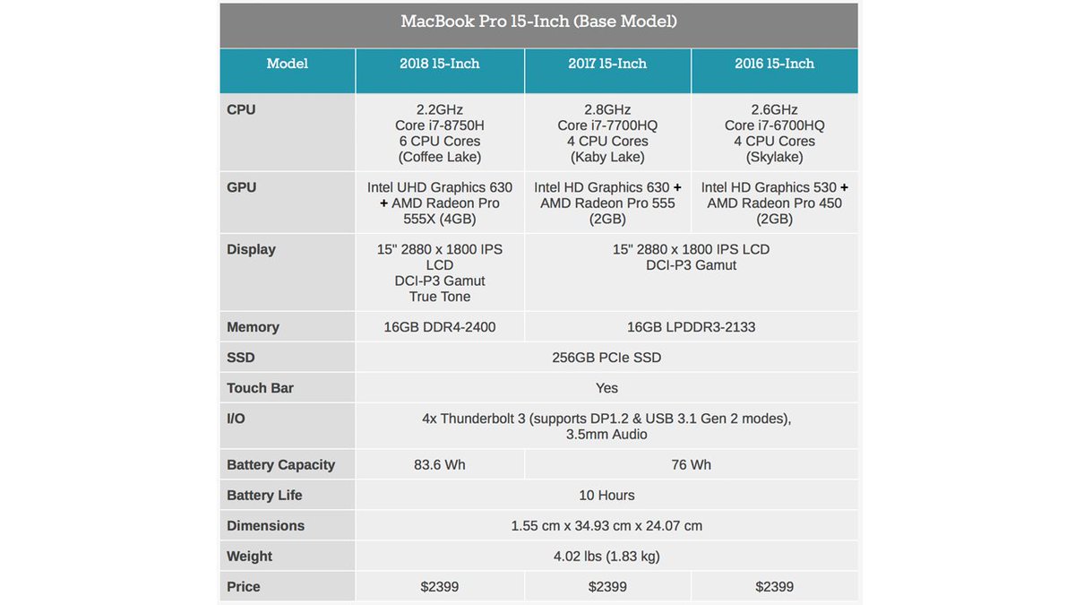 @Alex4D New MacBook Pros announced. Up to 70% CPU speed increase, twice GPU RAM to 4GB, option for 32GB RAM for the same price. Also faster SSD performance via the T2 co-processor introduced in iMac Pro https://www.anandtech.com/show/13073/apple-updates-macbook-pro-family-for-2018 … pic.twitter.com/zloXxCLCRE#tech#dev#engineering