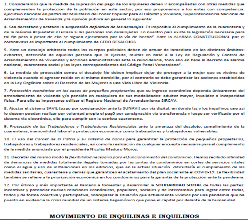 Ante la emergencia mundial por el #Coronavirus ¡saludamos decisión del presidente @NicolasMaduro de supresión de pago de arrendamientos por 6 meses!. Esta medida debe ir acompañada, entre otras acciones, con la prohibición de desalojos para garantizar el derecho a la vivienda.pic.twitter.com/mdtyKnbO1p