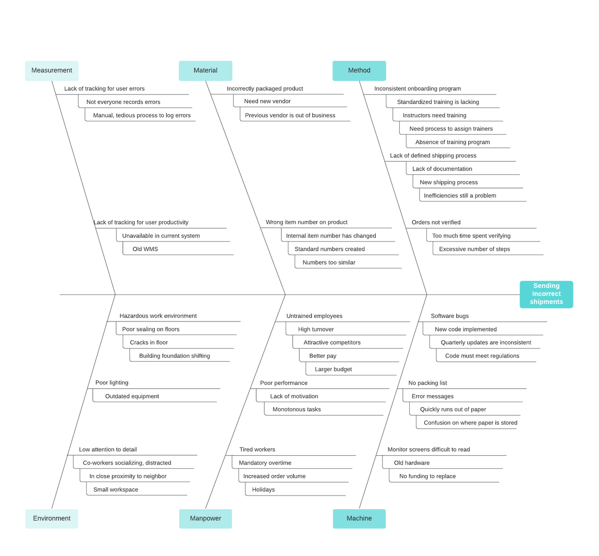 Fishbone diagrams can help you effectively eliminate issues by examining a problem from multiple angles. Use this fishbone template for quality management to understand the underlying cause and effects of the issue at hand. http://bit.ly/3aScG5J