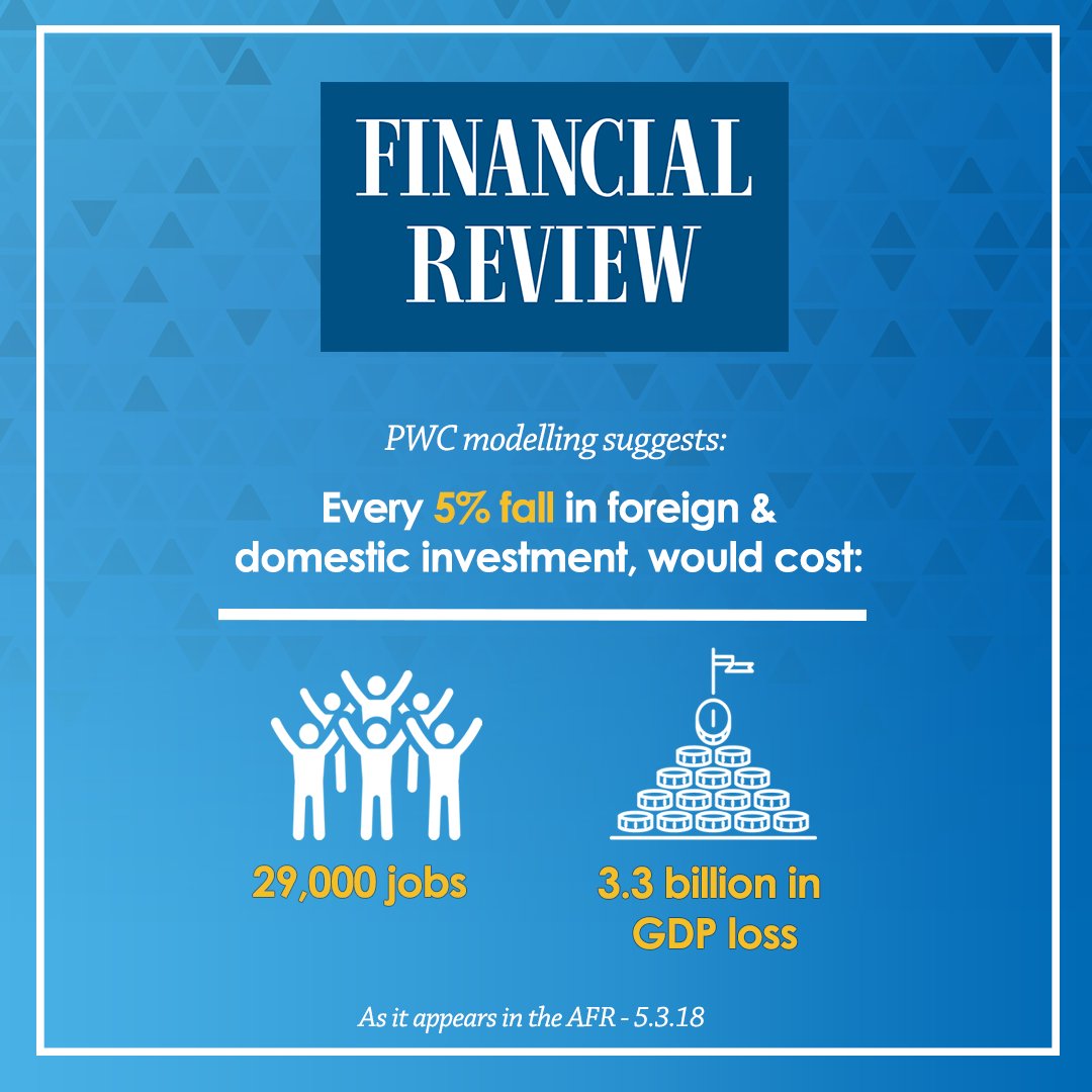 A 5% fall in investment could see us lose 29,000 Aussie jobs and over 3 billion in GDP. The modest 5 point cut to the existing company tax rate over 10 years is paramount to our future economic success.
