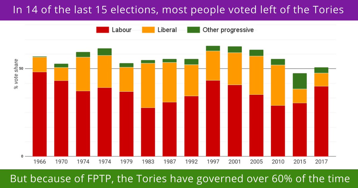 In 14 out of the last 15 General Elections, a clear majority voted "progressive". Yet the Tories have ruled for most of this time.pic.twitter.com/Ps6wXqWE4y