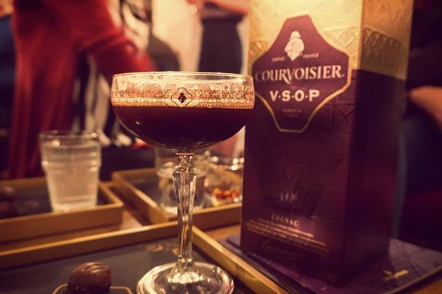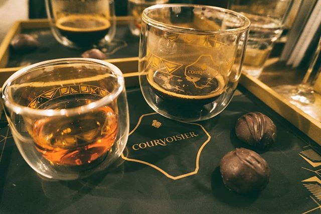 . A glass of @courvoisier.UK, ambient coffee and dark chocolate