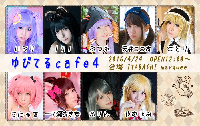 4/24(日)1日限定コスプレカフェイベント「ゆぴてるcafe4」ご予約受付中! 参加キャスト:いろり、lui、ふつれ、天井ここあ、ことり、うにゃる、一ノ瀬あきな、かりん、やむやみ http://circlejupiter.wix.com/jupiter-cafe4 pic.twitter.com/TjCTkHCrPQ