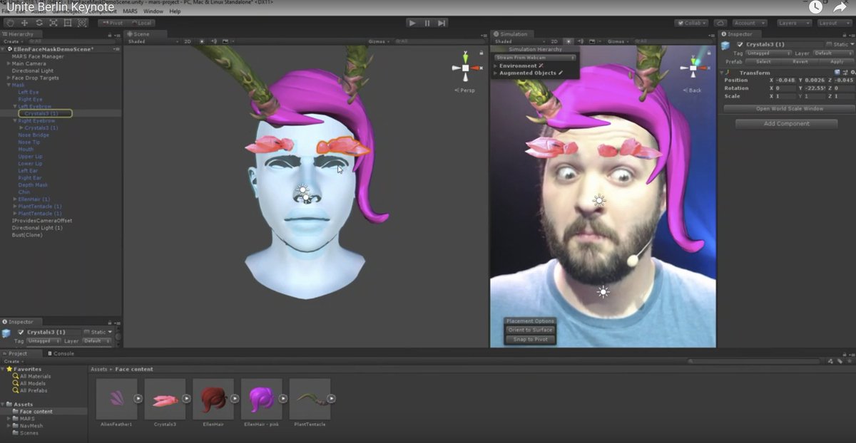 @timoni announced Project MARS (Mixed & Augmented Reality Studio) at .@unity3d Berlin Unite. It has an#AR facial filter editor & a multi-plane editor to put together AR scenes in a wide range of spatial environments without code. Here's the announcement https://www.youtube.com/watch?v=3omw9dLkrR8&t=39m18s …pic.twitter.com/HEagSCR28A