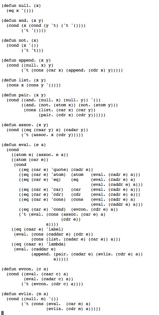 McCarthy's Lisp was 53 lines of code. (Or more precisely 53 lines of conventionally indented CL.)pic.twitter.com/mp2pVxrH5O