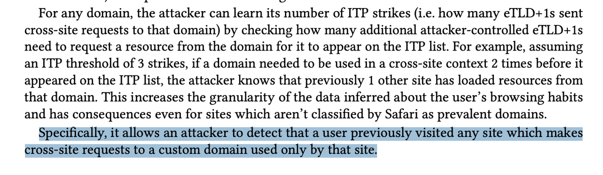 Apple/Safari Intelligent Tracking Prevention is a mechanism intended to improve privacy. It was found to have privacy vulnerabilities allowing sites to track the user (and fingerprint), and to stealing web browser history of a user. Incredible find. https://arxiv.org/pdf/2001.07421.pdf …pic.twitter.com/HR48ulUoHK