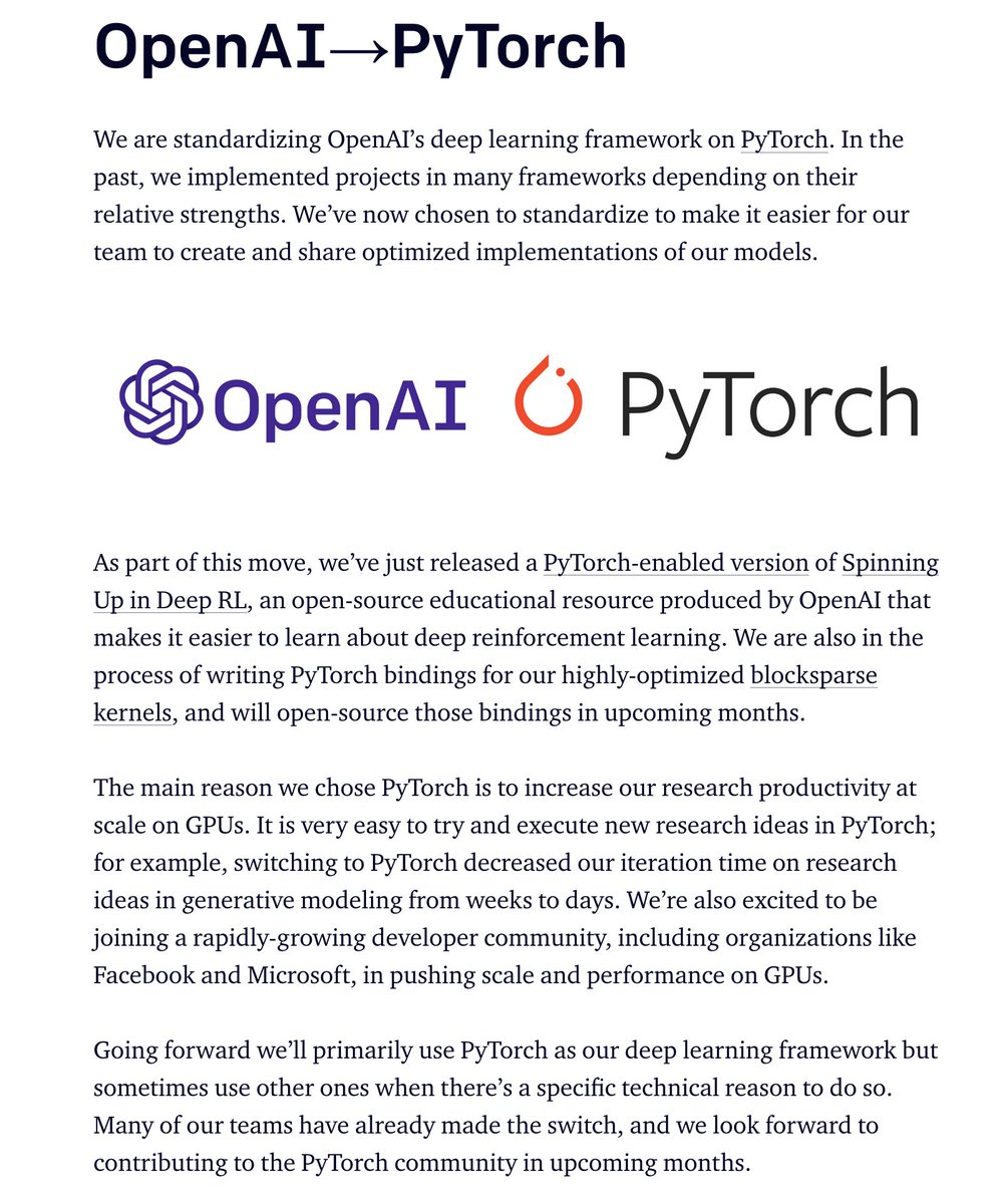 OpenAI published that they're moving all of their deep learning work to PyTorch (from Tensorflow, ostensibly.) It'll be interesting to see how that impacts the offerings at Azure. Context: https://vicki.substack.com/p/i-spent-1-billion-and-all-i-got-was …pic.twitter.com/PRBsBEa9T6