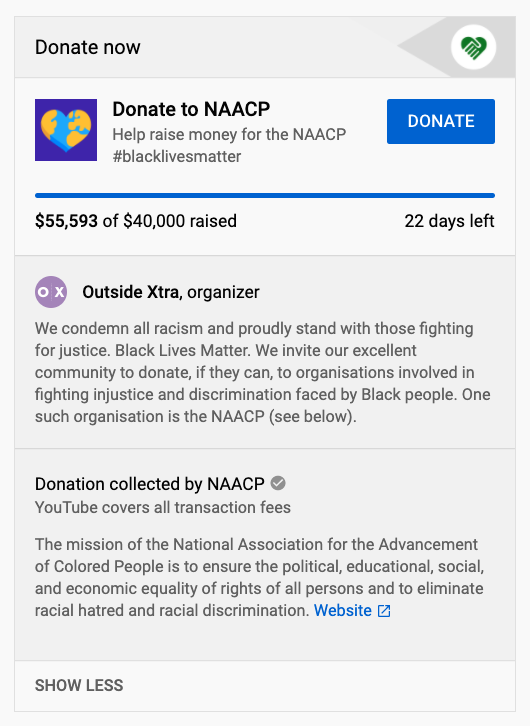 @OutsideXbox last week, you helped raise over $40,000 for the@NAACP. Since then, the total has ticked up to over $55,000. Thank you so so much. Black Lives Matter