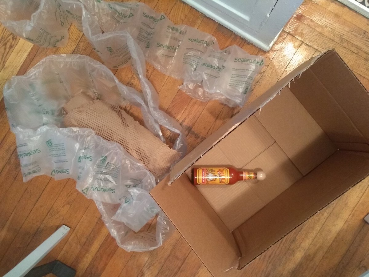 @Walmart was a giant 19"x12.5"x9" box and tons of plastic really necessary to send me one bottle of@CholulaHotSauce? Packaging fail.pic.twitter.com/QxF9iRoIFC