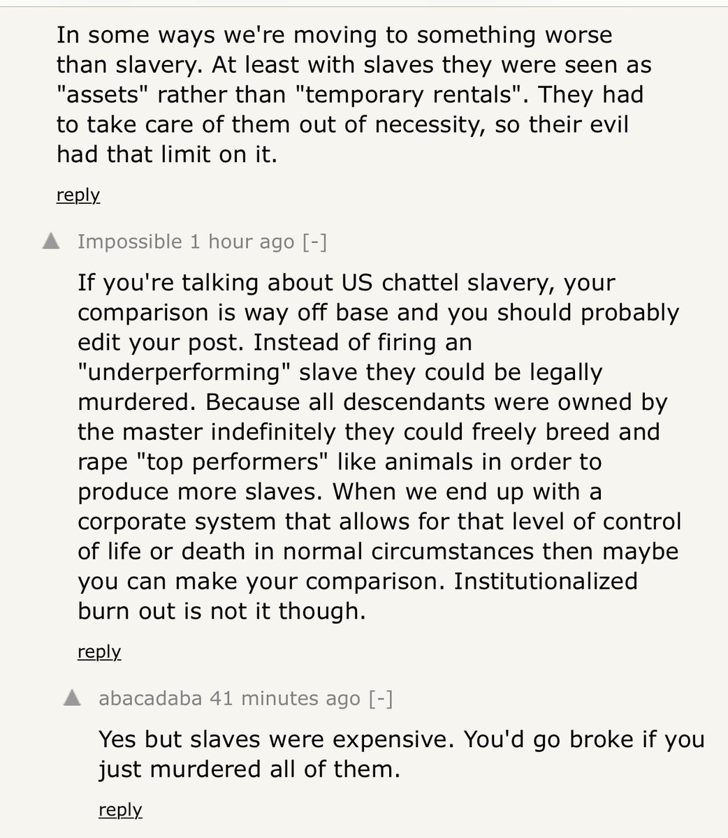 HN rando: burnout culture is worse than slavery. Reply: oh come on it is not, that’s disgusting what is wrong with you? Counter: I dunno man at least slaves were expensive.pic.twitter.com/ZGUe6nAOfG