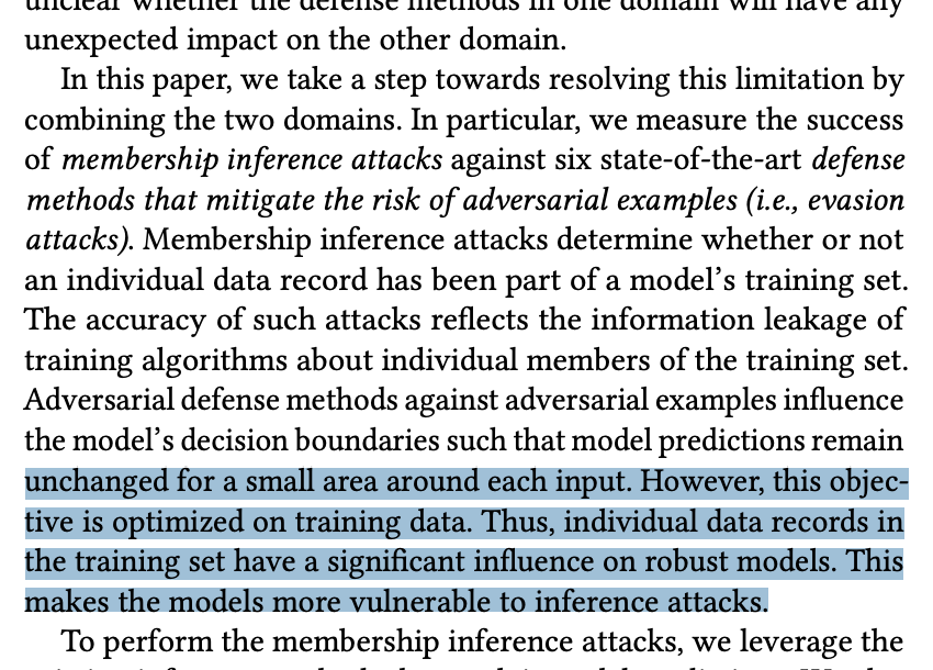 To secure models against adversarial examples, defense methods push decision boundaries away from (training) data. This increases the influence of training points on models, making them significantly vulnerable to privacy attacks that infer training data. https://arxiv.org/pdf/1905.10291.pdf …