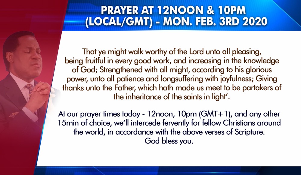 Pray-A-Thon 2020 - Mon Feb 3rd The Global Communion Service for the month of February held yesterday. It was glorious fellowshiping with the Lord and with one another, as we were ushered into the Month of Songs. Hallelujah! ...