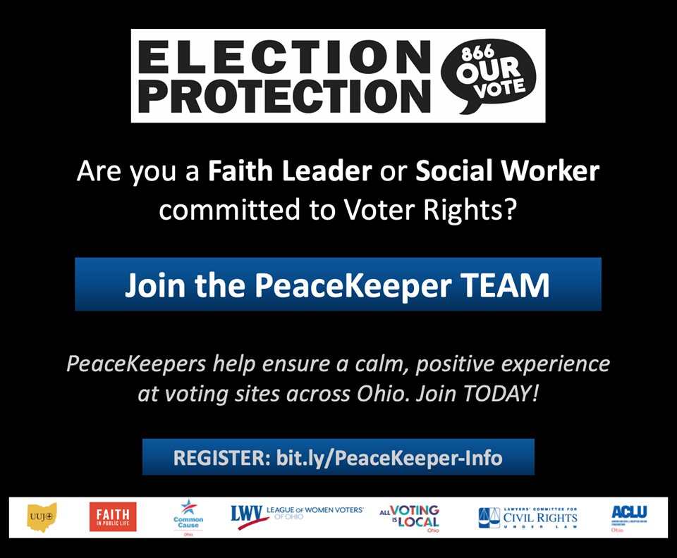 Join the **PeaceKeeper** Team Faith leaders & social workers committed to voter rights are needed as PeaceKeepers at Early Voting Centers & Election Day Polling sites. Must complete training session Training Dates: Oct 20, 2 PM Oct 22, 6:30 PM REGISTER: http://bit.ly/PeaceKeeper-Info …pic.twitter.com/Ze7ylBO0mG