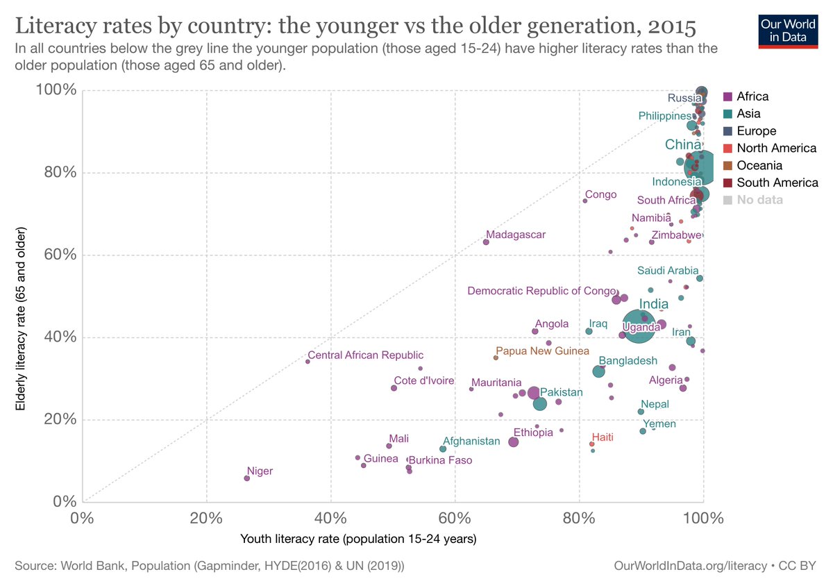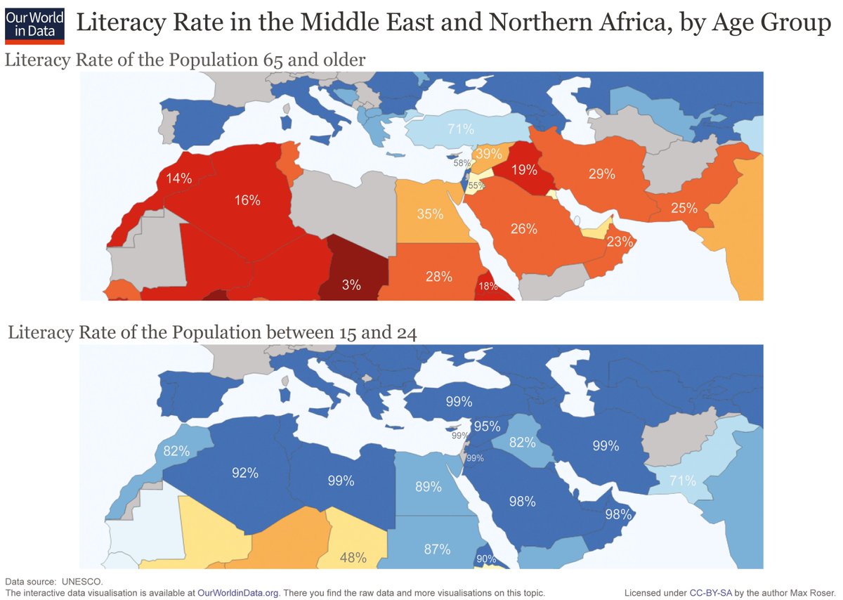 #LiteracyDay2020 A trend I find very interesting on this topic: N Africa and the Middle East have drastically improved literacy in just one generation In Algeria literacy rate among youth is 97% while it is 28% for 65+ More charts and data: https://ourworldindata.org/literacy pic.twitter.com/bmZxvoSiRe