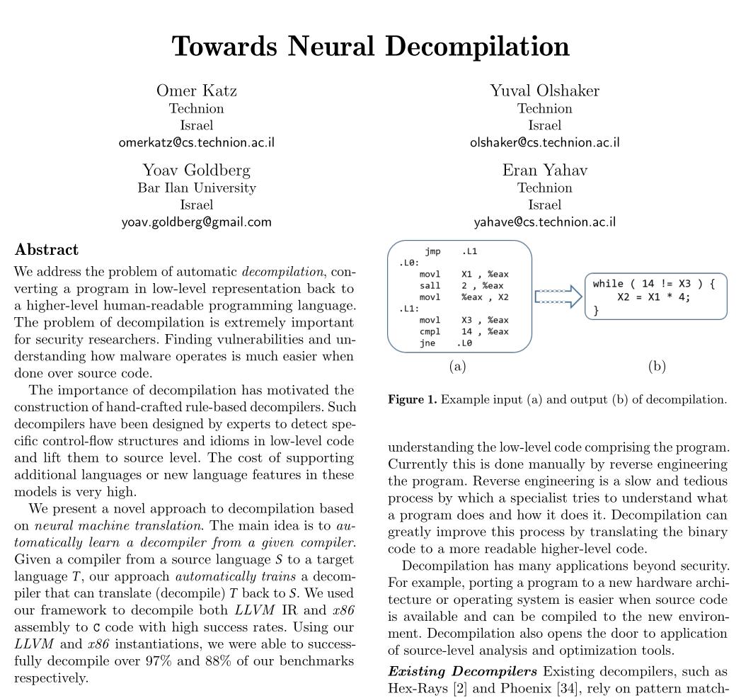 Towards Neural Decompilation https://arxiv.org/abs/1905.08325 TraFix: a two-phased (Translate and Fix) automatic trainable decompiler based on NMT https://github.com/omerktz/trafix Omer Katz, Yuval Olshaker, Yoav Goldberg (