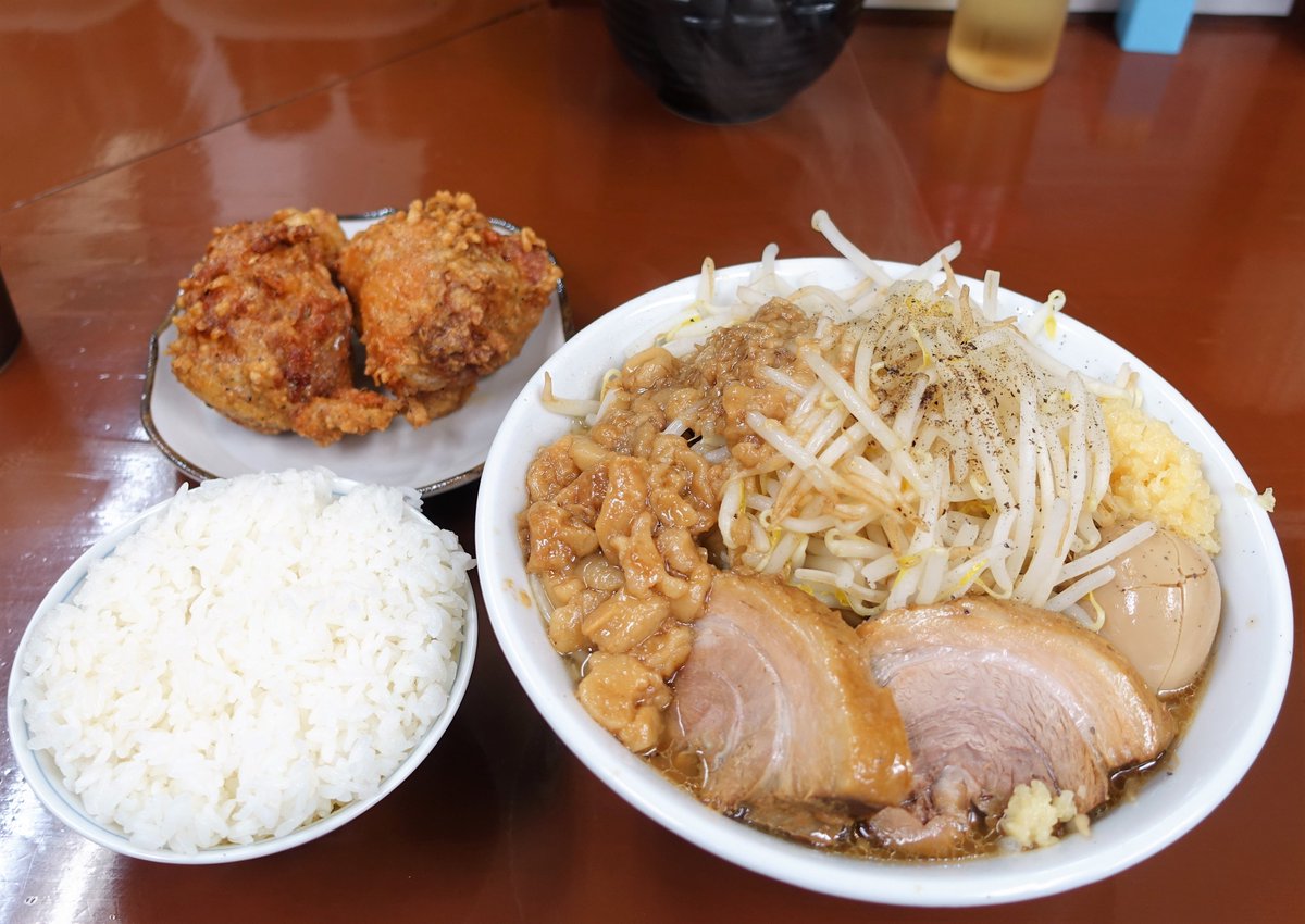 らぁめん たむらさんに自転車でお邪魔して、限定『じろぉらぁめん』、からあげ、ライス小を頂きました。 豚骨ベースのスープに、味付トロトロ背脂の相性が抜群! ブラックペッパーと刻みニンニクでジャンキー感UP! 腰が強いつけ麺用の麺をすすると最高に旨い