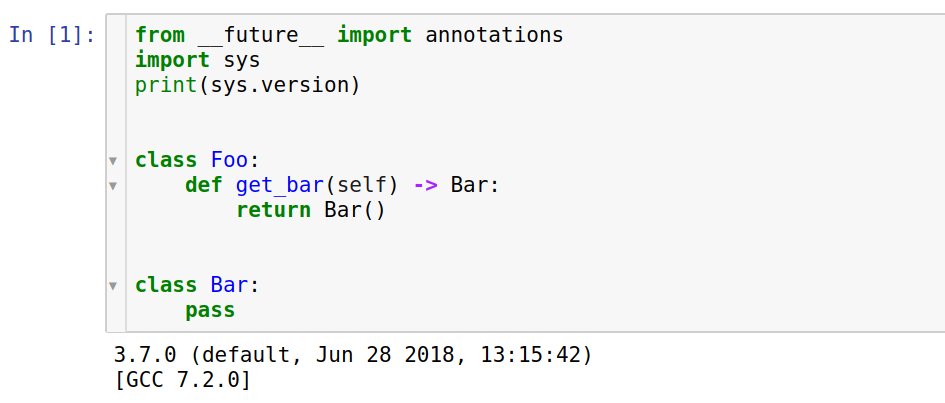 Some useful changes coming with py-3.7: - dicts preserving insert. order have been declared a part of language spec. - when writing type hints, we can use names that are not yet in scope - dataclasses! I *love* those for writing configs especially.