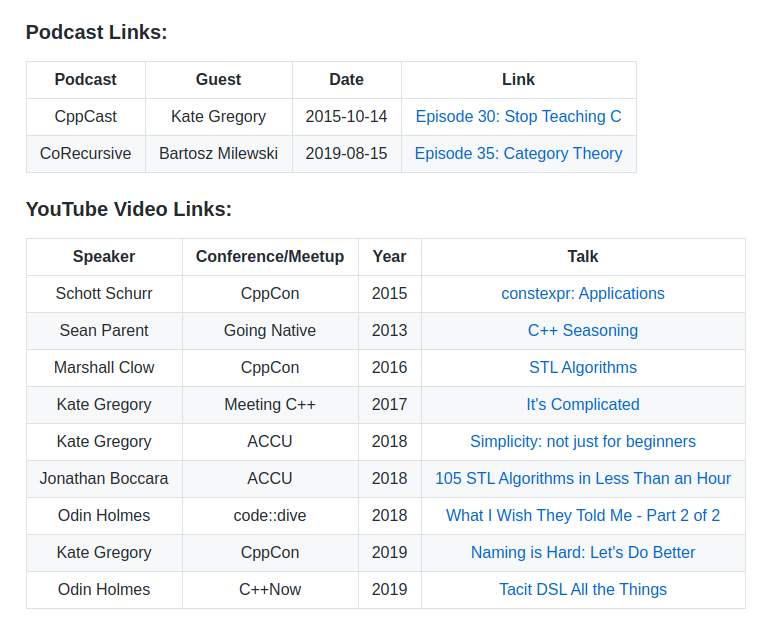 Can be found on my github: https://github.com/codereport/Talks/blob/master/2019-11-MeetingC++/BetterAlgorithmIntuition/YoutubeAndPodcastLinks.md … #cpp#algorithms Thank you to everyone on the list! Especially@gregcons as her name appears 4 times!pic.twitter.com/Fk4LMxVMjg