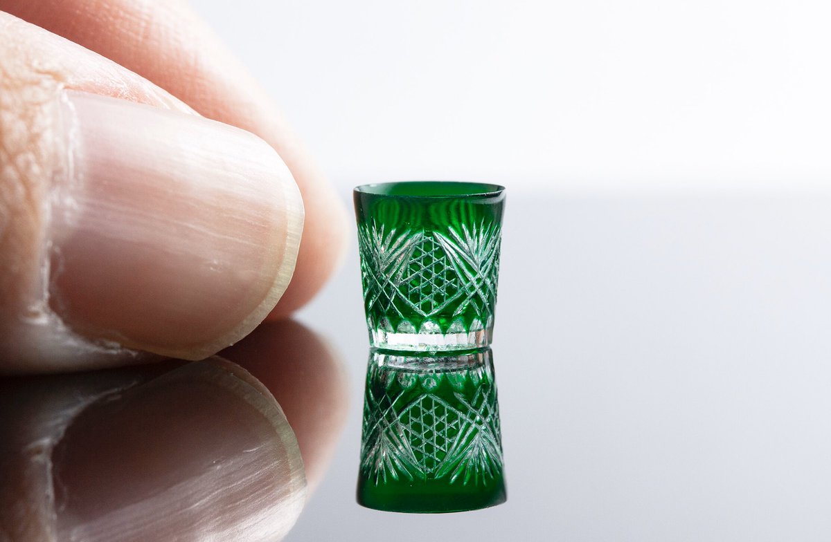 緑の切子グラス1 お問い合わせいただいていた緑のグラスは2種類作りました。 こちらは六角籠目と笹の葉の紋様のものです。 この紋様は1番よく作りますが綺麗に彫刻するのが難しいです。